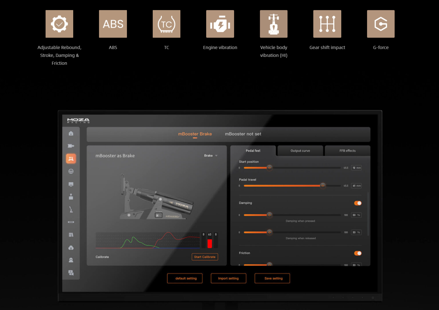 - Wheel Lock Simulation (ABS): Thanks to the advanced software, the mBooster is able to simulate wheel locking during braking, offering realistic tactile feedback that helps you modulate the pedal pressure and maintain control of the car.