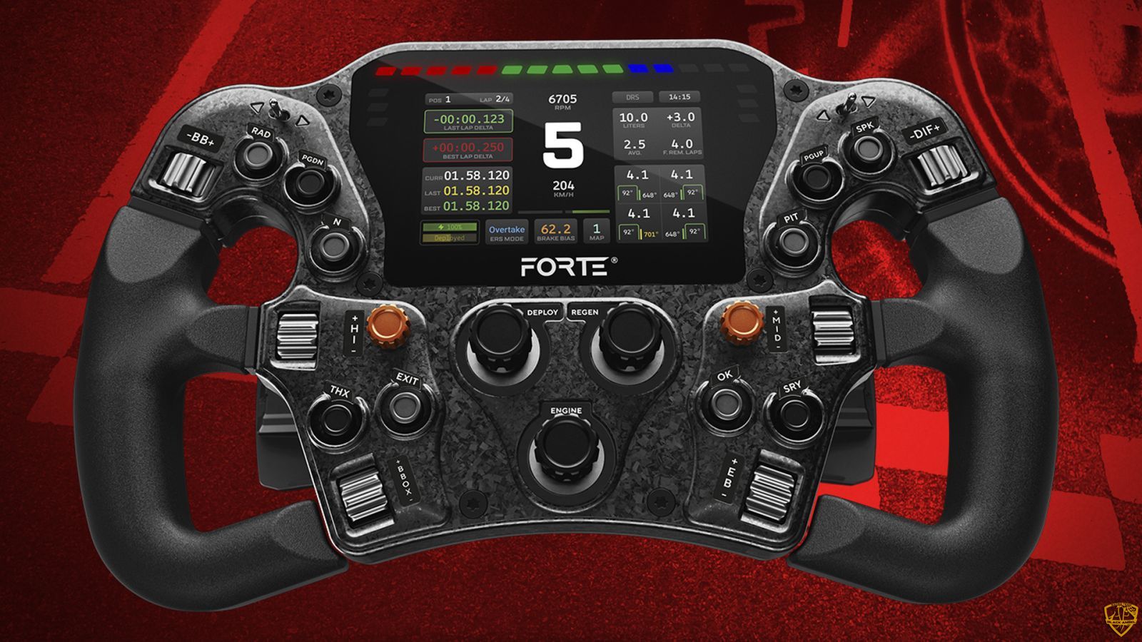 One of the most interesting features is the presence of rotary encoders, perfect for adjusting parameters such as brake balance, engine mapping or traction control in a precise and intuitive way. The shift paddles are made of carbon fiber, offering a solid tactile feel and a quick and precise response to each gear change.