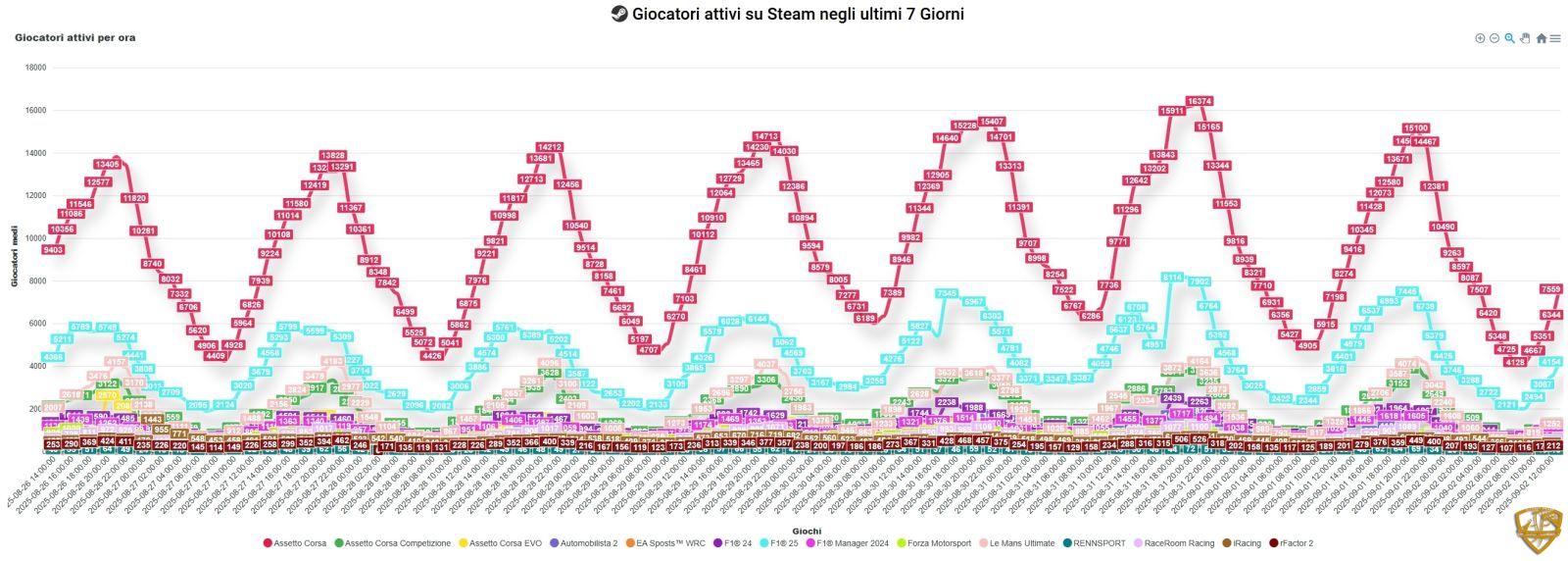 Assetto Corsa (red) dominates the chart unchallenged, with peaks consistently touching 15,000-16,000 simultaneous players. These exceptional numbers testify to the longevity and quality of a title that, despite not being the newest, continues to be the reference point for pure sim racing enthusiasts.