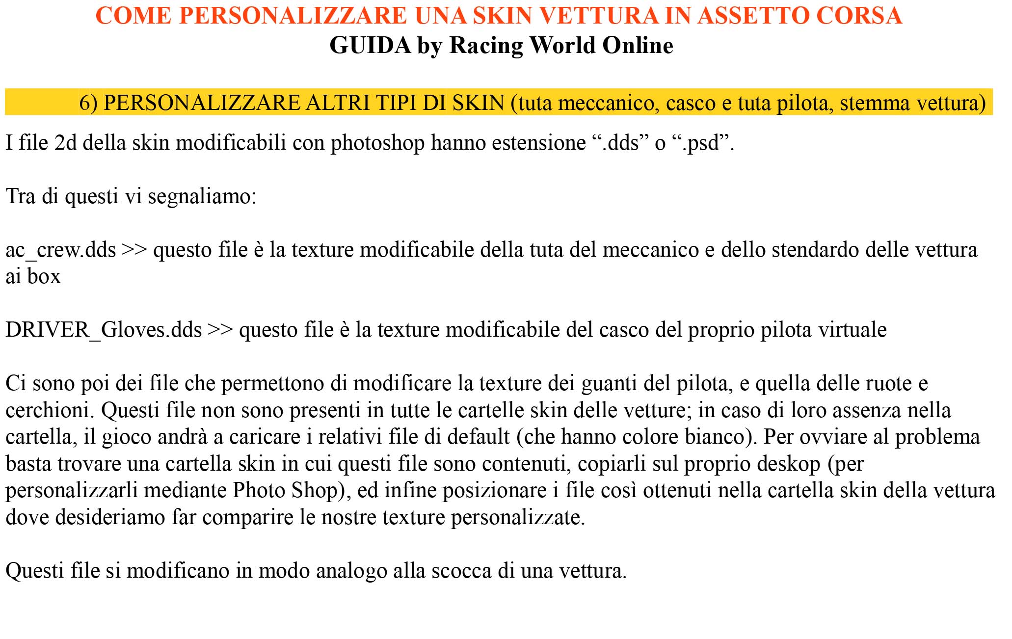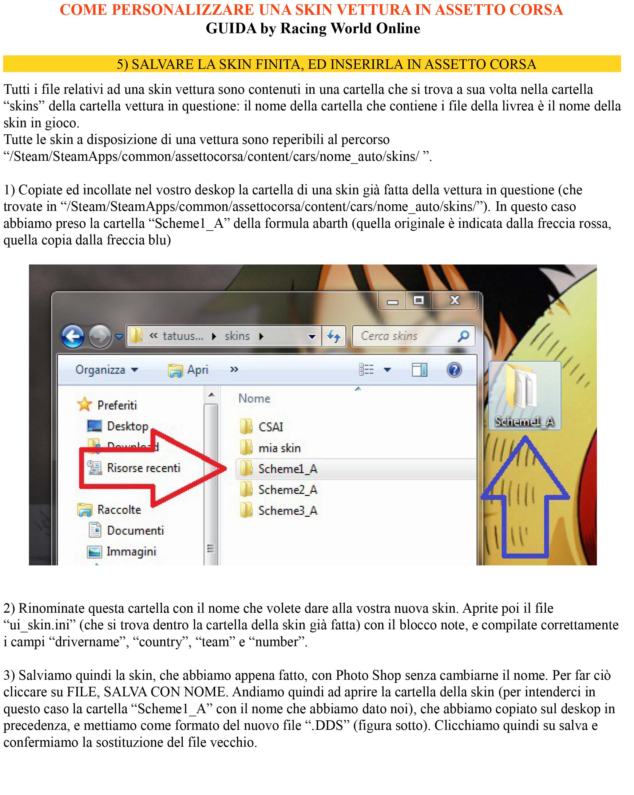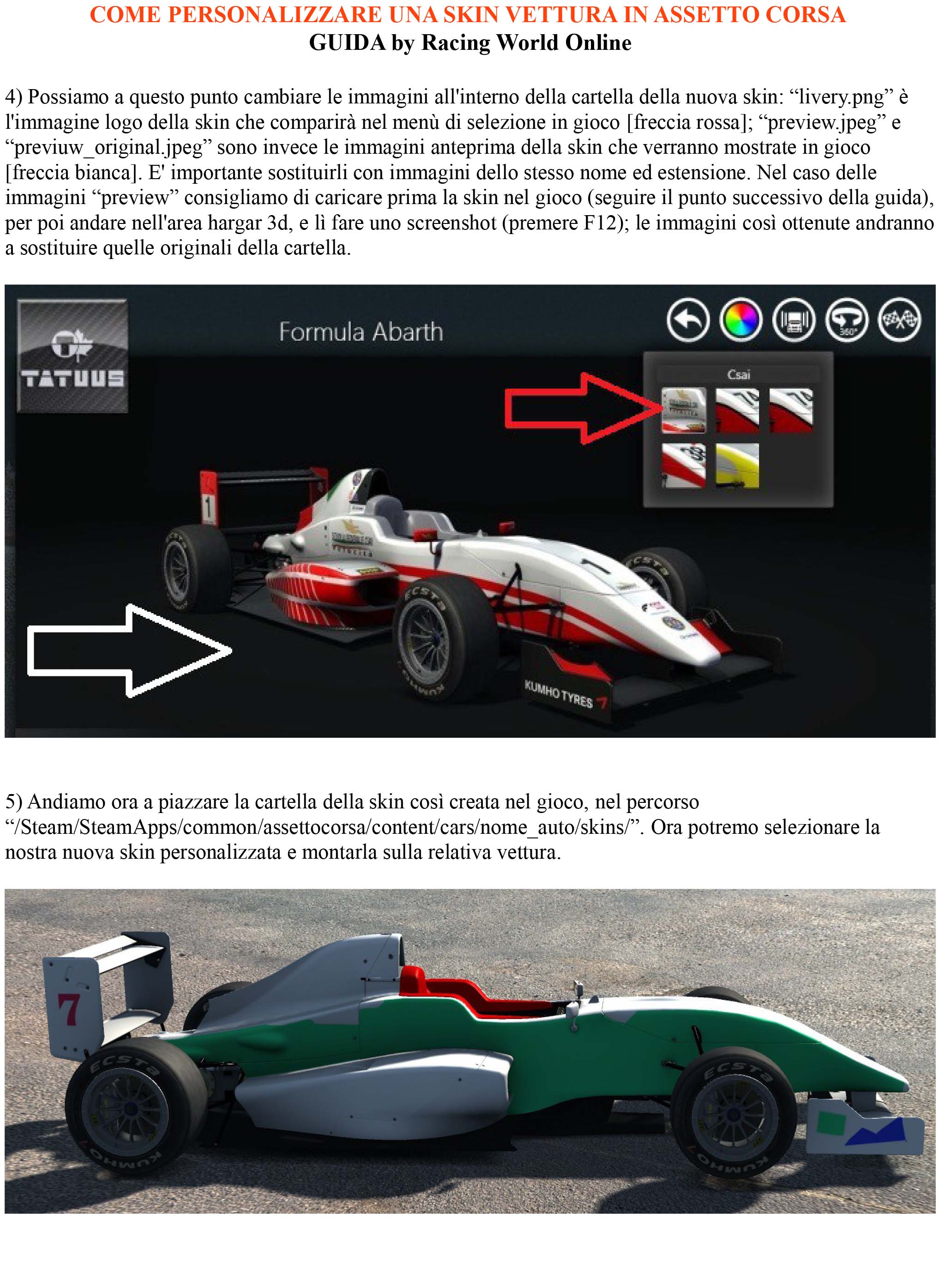 Assicuratevi che non ci siano spazi nel nome della cartella, o non vi apparirà l’anteprima della skin nel menù di AC.