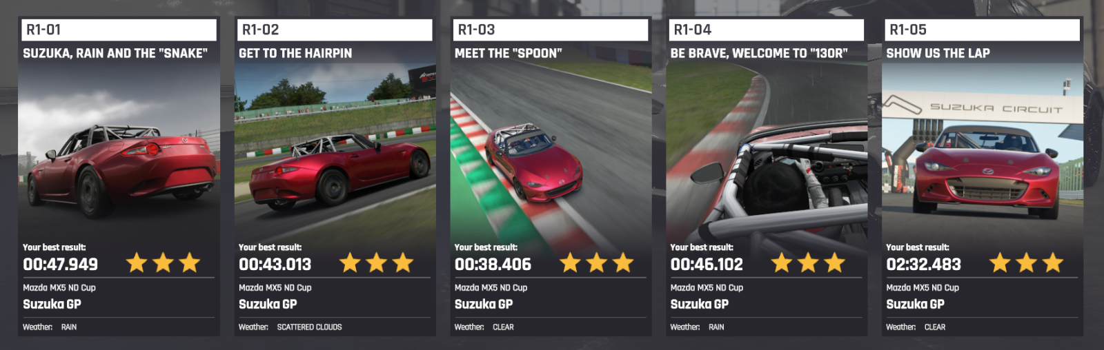 The Racing 1 License introduces you to the world of race cars on the Suzuka circuit, a technical and demanding track with fast corners and mixed sections.